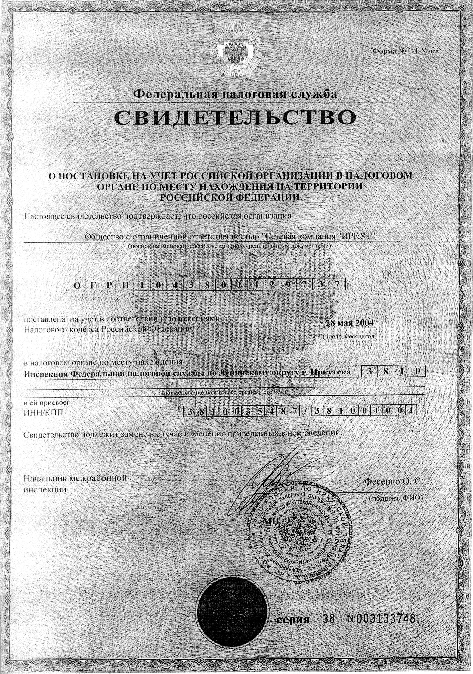 Свидетельство о постановке на учет в налоговом органе