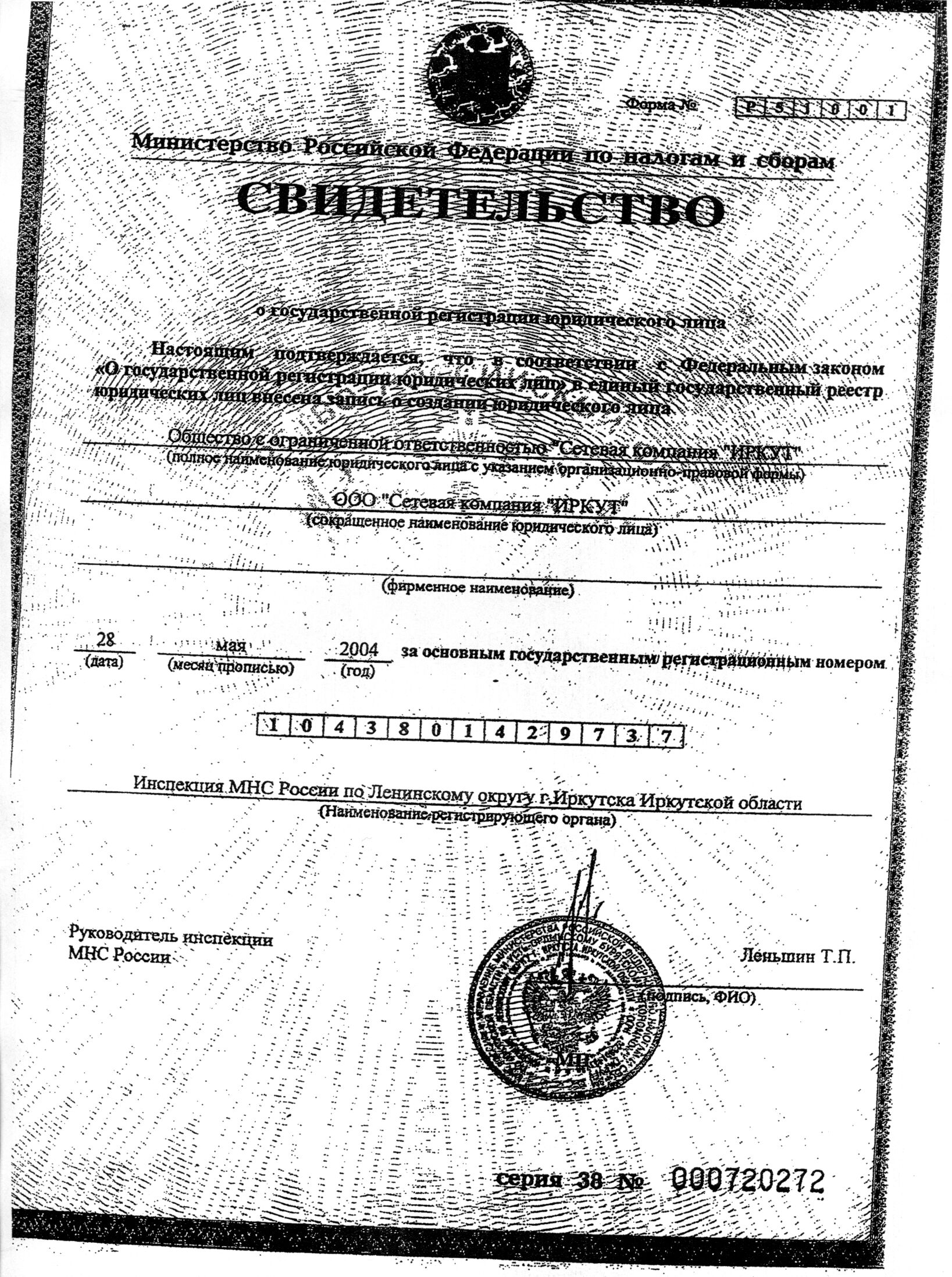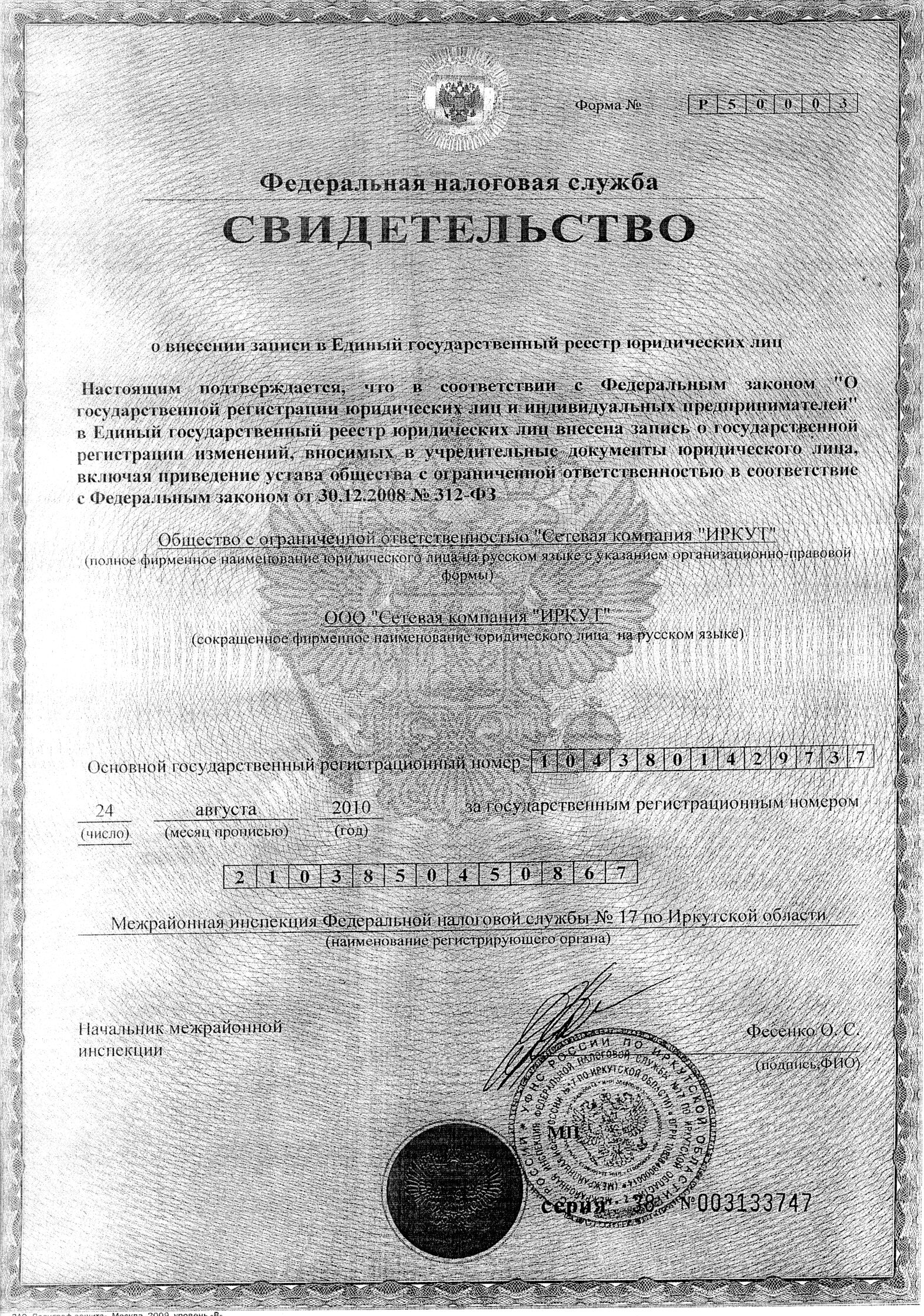 Свидетельство о внесении записи в ЕГРЮЛ
